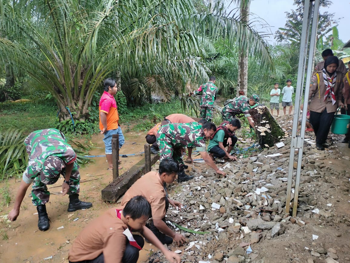 Hadir dalam pelaksanaan kegiatan gotong royong yang dilaksanakan selain anggota Koramil 16/BTN dan anak Pramuka dari MAN 4 Madina juga dihadiri Kepala desa, pengurus mesjid Baiturrahman dan Ketua NNB desa Kampung Baru.
