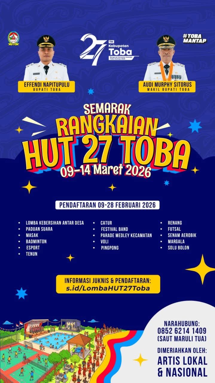 ANTARANEWS86.com_, TOBA, Peringatan hari jadi ke-27 Kabupaten Toba akan berlangsung meriah dengan berbagai kegiatan lomba. Berikut rangkaian kegiatan yang akan digelar sejak Senin 9 Maret hingga Sabtu 14 Maret.