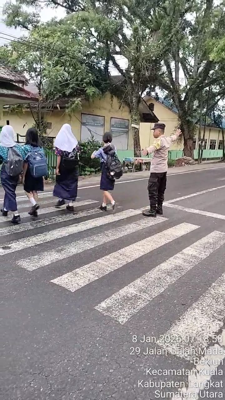 ANTARANEWS86.com_, LANGKAT, Dalam rangka menciptakan keamanan, keselamatan, ketertiban, dan kelancaran lalu lintas, Bhabinkamtibmas Polsek Kuala Aiptu Samuel Sembiring melaksanakan kegiatan sambang sekaligus pengaturan arus lalu lintas di simpang depan SMP Negeri 1 Kuala, Kecamatan Kuala, Kamis (8/1/2026) pagi.