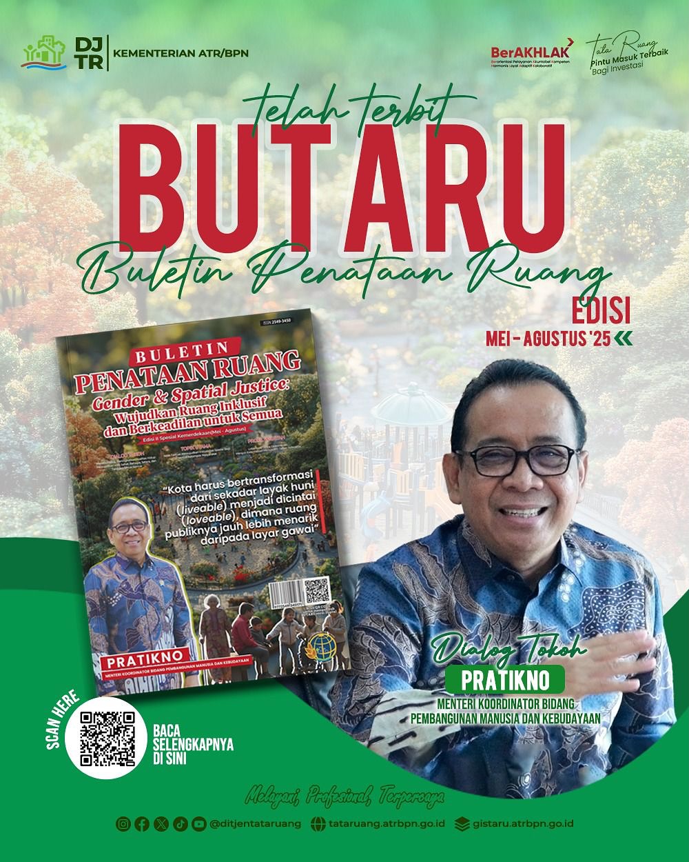 Jakarta,Antaranews86.com – Direktorat Jenderal Tata Ruang Kementerian ATR/BPN kembali menghadirkan Buletin Penataan Ruang (BUTARU) Edisi II. Pada edisi kali ini, BUTARU mengangkat tema “Gender & Spatial Justice: Wujudkan Ruang Inklusif dan Berkeadilan untuk Semua” sebagai isu strategis dalam mewujudkan pembangunan berkelanjutan menuju Indonesia Emas 2045.