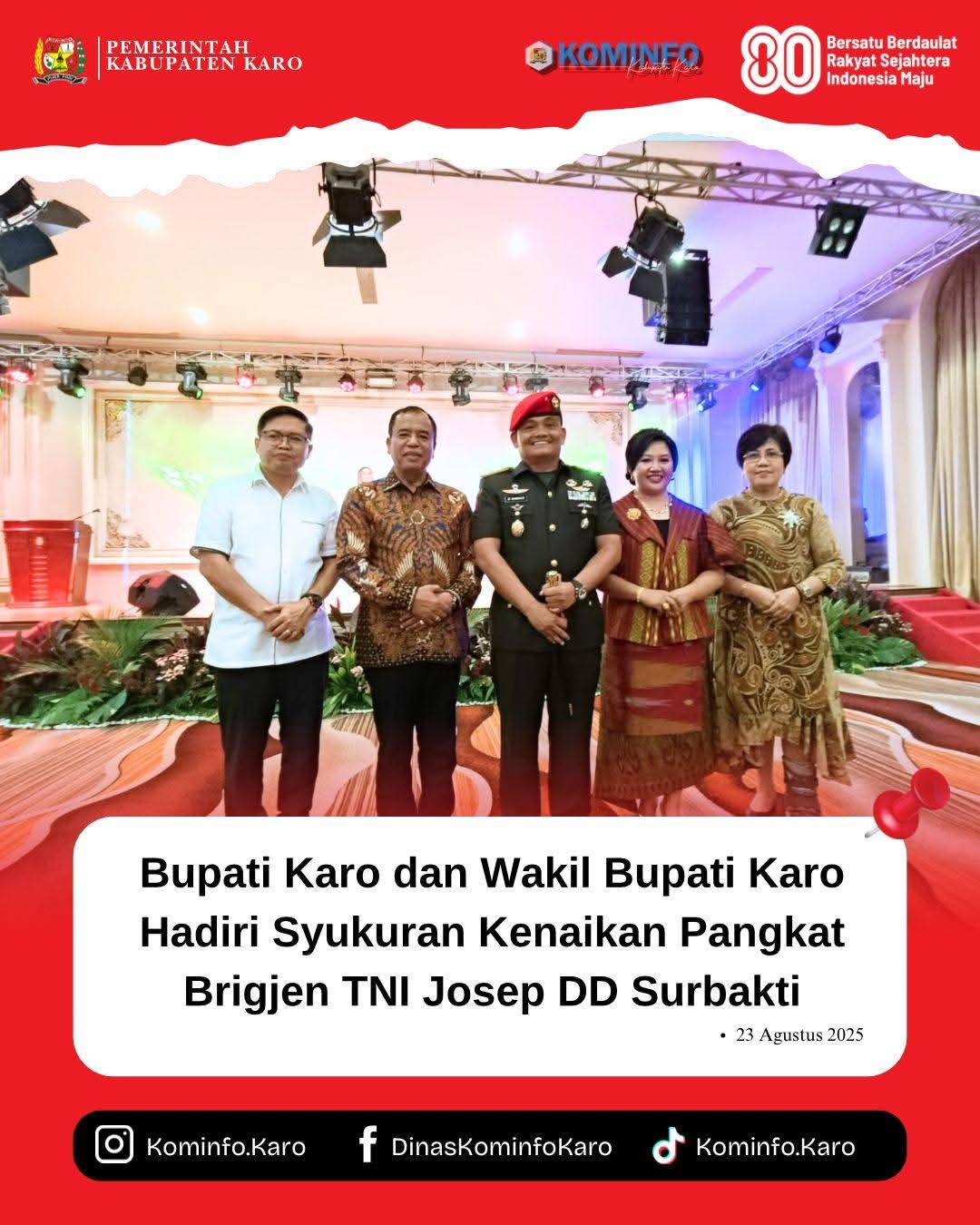 “ Atas nama pribadi dan masyarakat Kabupaten Karo kami sampaikan selamat dan sukses atas kenaikan pangkat ini. Semoga kesuksesan dalam pengabdian kepada negara dan bangsa Indonesia tetap mengiringi Brigjen TNI Josep D.D. Surbakti, S.E., M.Han,” ujar Bupati Karo.