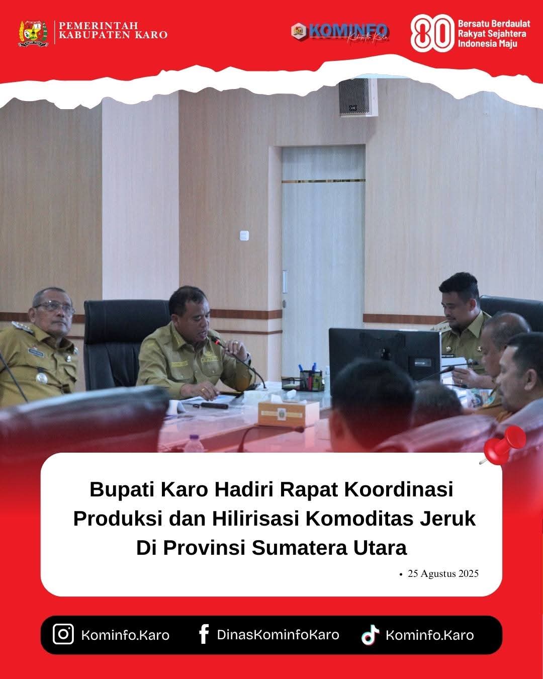 KARO (SUMUT) ANTARANEWS86.COM//Bupati Karo, Brigjen Pol (Purn) Dr. dr. Antonius Ginting, Sp.OG., M.Kes., menghadiri Rapat Koordinasi Peningkatan Produksi dan Hilirisasi Pascapanen Komoditas Jeruk yang digelar di Kantor Gubernur Sumatera Utara, Jalan Diponegoro Nomor 30, Medan pada Senin, (25/8).