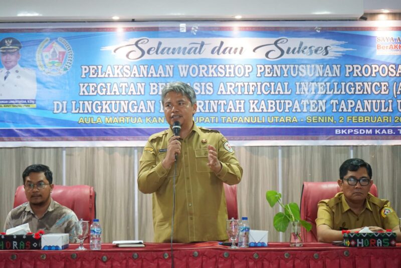 ANTARANEWS86.com_, TAPUT, Pemerintah Kabupaten Tapanuli Utara terus mendorong percepatan transformasi digital di lingkungan birokrasi. Hal tersebut diwujudkan melalui Workshop Penyusunan Proposal Kegiatan Berbasis Artificial Intelligence (AI) atau Kecerdasan Buatan yang dibuka secara resmi oleh Wakil Bupati Tapanuli Utara Dr. Deni Parlindungan Lumbantoruan, M.Eng, didampingi Sekretaris Daerah Drs. Henry M. M. Sitompul, M.Si dan Pelaksana Tugas (Plt.) Kepala BKPSDM Jenri Simanjuntak, di Aula Martua Kantor Bupati Tapanuli Utara, Tarutung, Senin (2/2/2026).