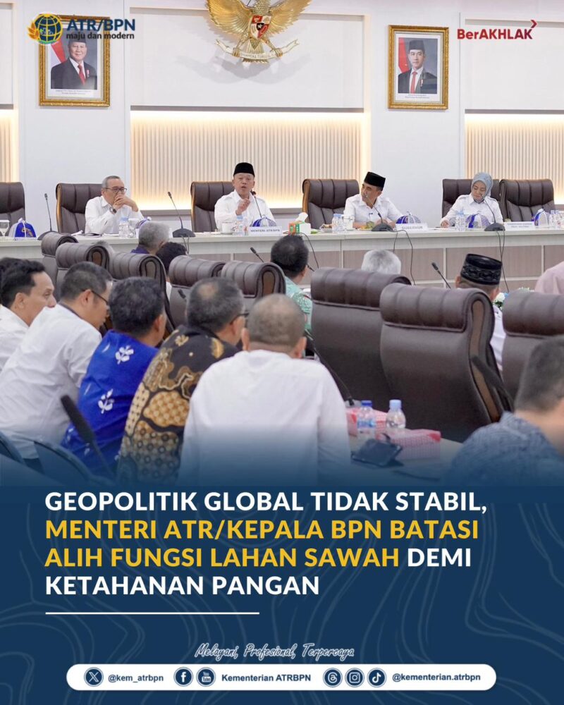 Antaranews86.com, Palu – Di tengah kondisi geopolitik global yang tidak stabil, Menteri Agraria dan Tata Ruang/Kepala Badan Pertanahan Nasional (ATR/BPN), Nusron Wahid, menegaskan bahwa ketahanan pangan menjadi prioritas nasional. Oleh karena itu, Kementerian ATR/BPN menerapkan pembatasan alih fungsi lahan sawah maksimal hanya 11% dari total Lahan Baku Sawah (LBS), sementara sekitar 89% sisanya wajib dilindungi.