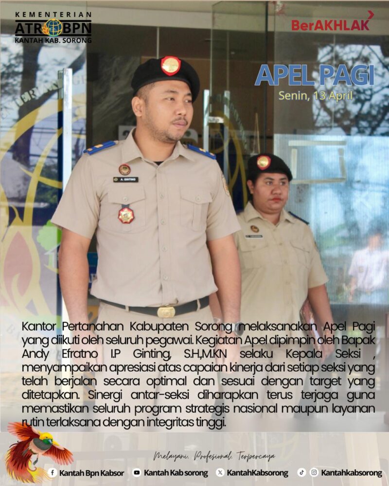 Segenap jajaran pegawai Kantor Pertanahan Kabupaten Sorong mengikuti kegiatan Apel Pagi yang dipimpin langsung oleh Kepala Seksi, Bapak Andy Efratno I.P Ginting, S.H., M.KN.