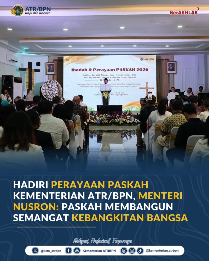 Antaranews86.com, Tangerang Selatan – Menteri Agraria dan Tata Ruang/Kepala Badan Pertanahan Nasional (ATR/BPN), Nusron Wahid, menghadiri Perayaan dan Ibadah Paskah Persekutuan Umat Kristiani Kementerian ATR/BPN pada Jumat (24/04/2026). Ia mengajak seluruh jajaran untuk menjadikan momentum Paskah sebagai titik kebangkitan bersama, tidak hanya secara spiritual, tetapi juga dalam kehidupan berbangsa dan bernegara.