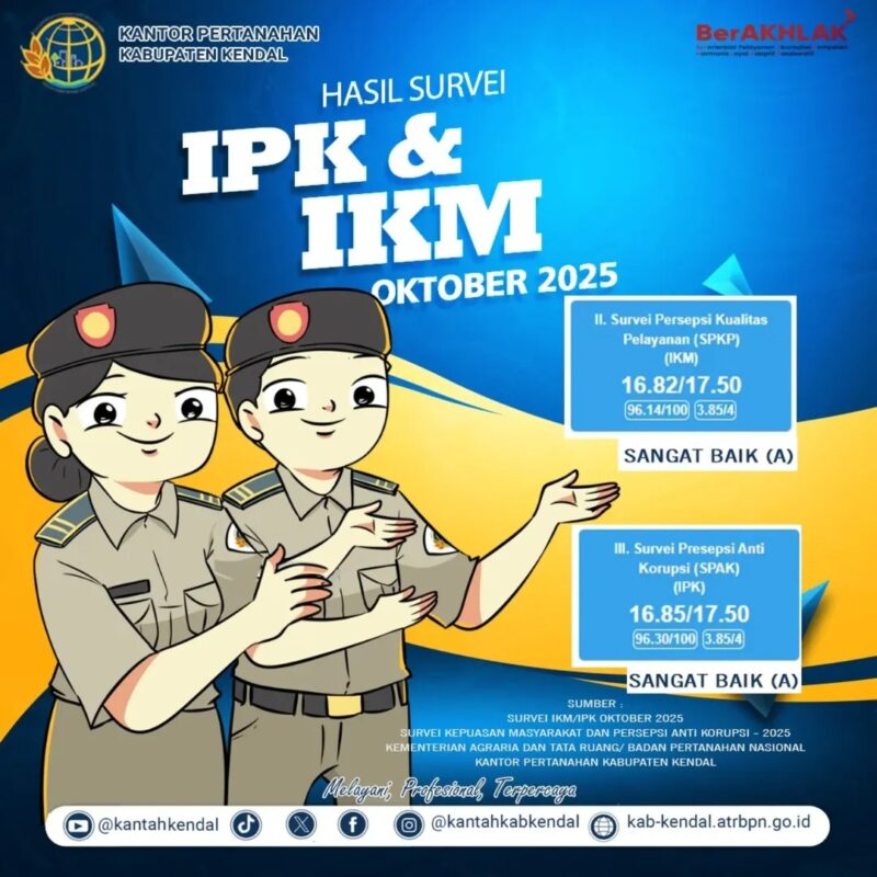 ​Berikut hasil Case Survey Management System bulan Oktober 2025 dengan Survei Persepsi Kualitas Pelayanan (IKM) adalah 16,82/17,50 (Sangat Baik) A dan Survei Persepsi Anti Korupsi (IPK) adalah 16,85/17,50 (Sangat Baik) A. Terima kasih atas penilaian yang telah diberikan untuk Kantor Pertanahan Kabupaten Kendal pada Survei Persepsi Kualitas Pelayanan (IKM) dan Survei Persepsi Anti Korupsi (IPK). Satu penilain Anda berarti banyak bagi perbaikan dan peningkatan kualitas pelayanan kami.