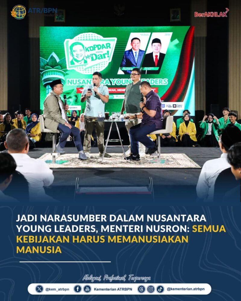 Antaranews86.com, Banyumas – Menteri Agraria dan Tata Ruang/Kepala Badan Pertanahan Nasional (ATR/BPN), Nusron Wahid, menjadi narasumber dalam acara Nusantara Young Leaders pada sesi “Total Politik” yang digelar di Banyumas, Jawa Tengah, Sabtu (25/04/2026). Pada sesi tanya jawab bersama mahasiswa, Menteri Nusron menceritakan pendekatan yang ia lakukan dalam memimpin kementeriannya menyelesaikan permasalahan terkait pertanahan.