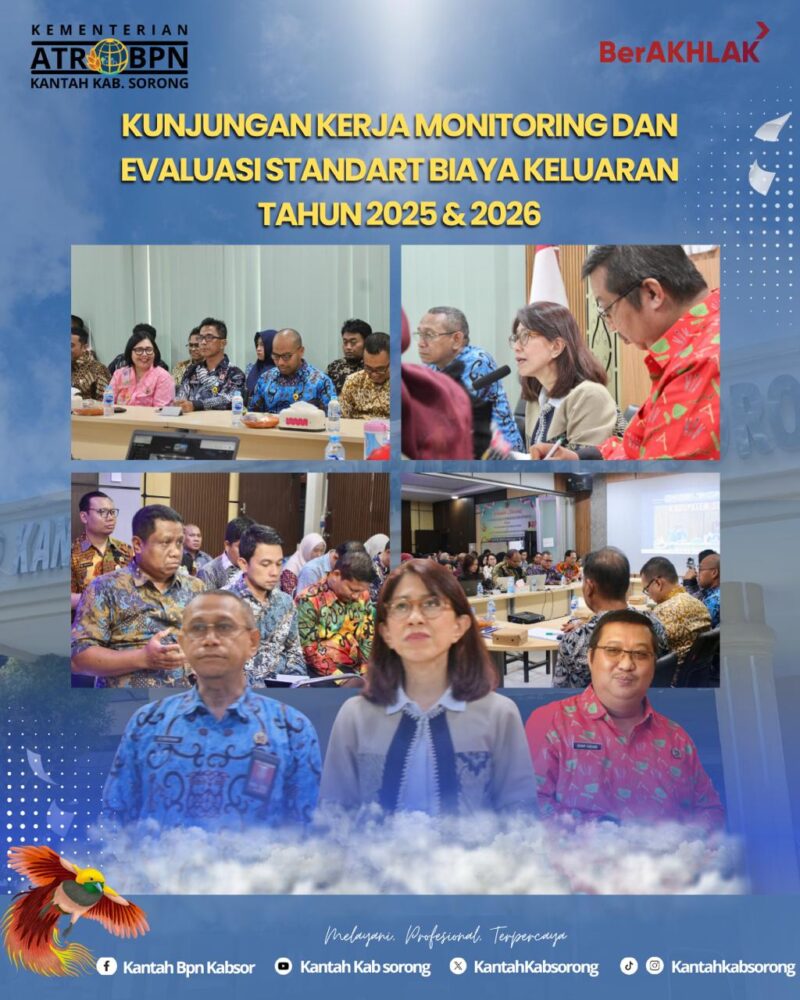 Antaranews86.com, Kamis, 16 April 2026. Dalam rangka memperkuat tata kelola keuangan yang transparan dan akuntabel, Kepala Kantor Pertanahan Kabupaten Sorong, Denny Aseano, S.H. menerima kunjungan kerja Monitoring dan Evaluasi Standart Biaya Keluaran Tahun 2025 dan 2026.