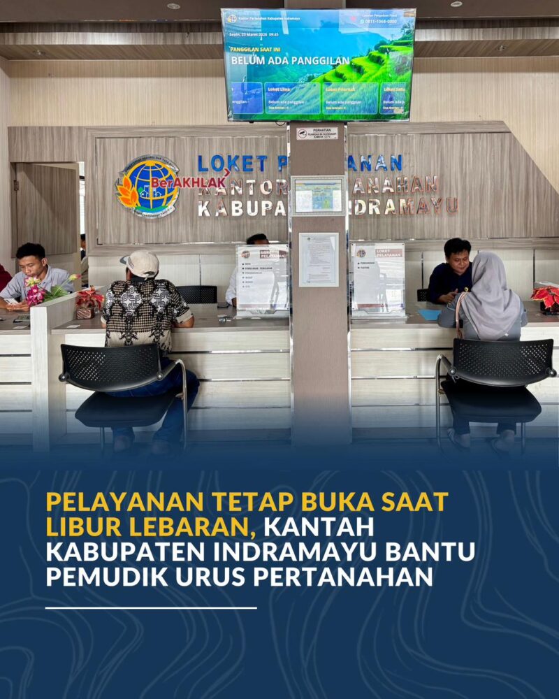 Antaranews86.com,Indramayu – Kementerian Agraria dan Tata Ruang/Badan Pertanahan Nasional (ATR/BPN) tetap membuka pelayanan bagi masyarakat selama libur panjang Idulfitri 2026. Kantor Pertanahan (Kantah) seperti di Kabupaten Indramayu, menghadirkan layanan terbatas untuk menjawab kebutuhan masyarakat, khususnya pemudik yang baru memiliki waktu mengurus administrasi pertanahan saat pulang kampung di momen libur Lebaran.