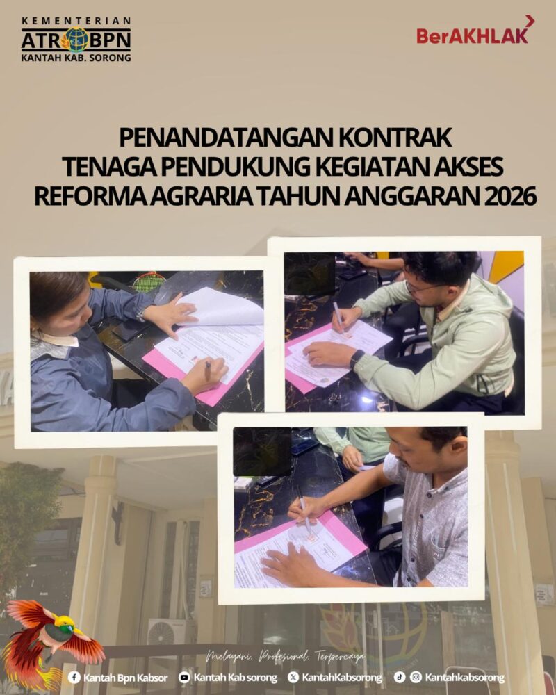 Kantor Pertanahan Kabupaten Sorong telah melaksanakan agenda resmi penandatanganan kontrak Pengadaan Jasa Tenaga Pendukung Kegiatan Akses Reforma Agraria untuk Tahun Anggaran 2026.