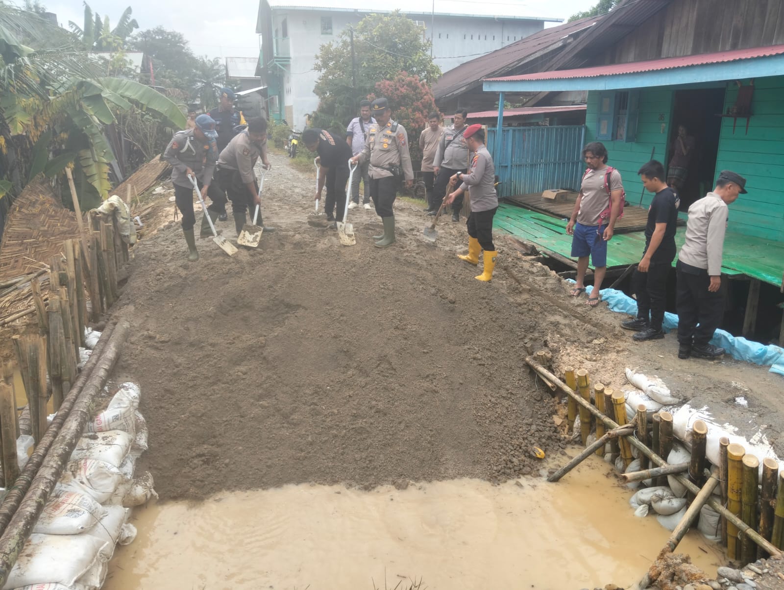 Kegiatan dipimpin langsung oleh Kapolsek Tanjung Pura IPTU Mimpin Ginting, S.H., M.H., bersama Danki Gas Pasmob I Binjai IPDA Usmanto, S.H., serta didukung warga yang dikoordinir Kepling I, sdr. Acai. Perbaikan dilakukan dengan pemasangan pasak bambu, penahan karung pasir, serta penimbunan tanah dan sirtu pada titik tanggul yang jebol.