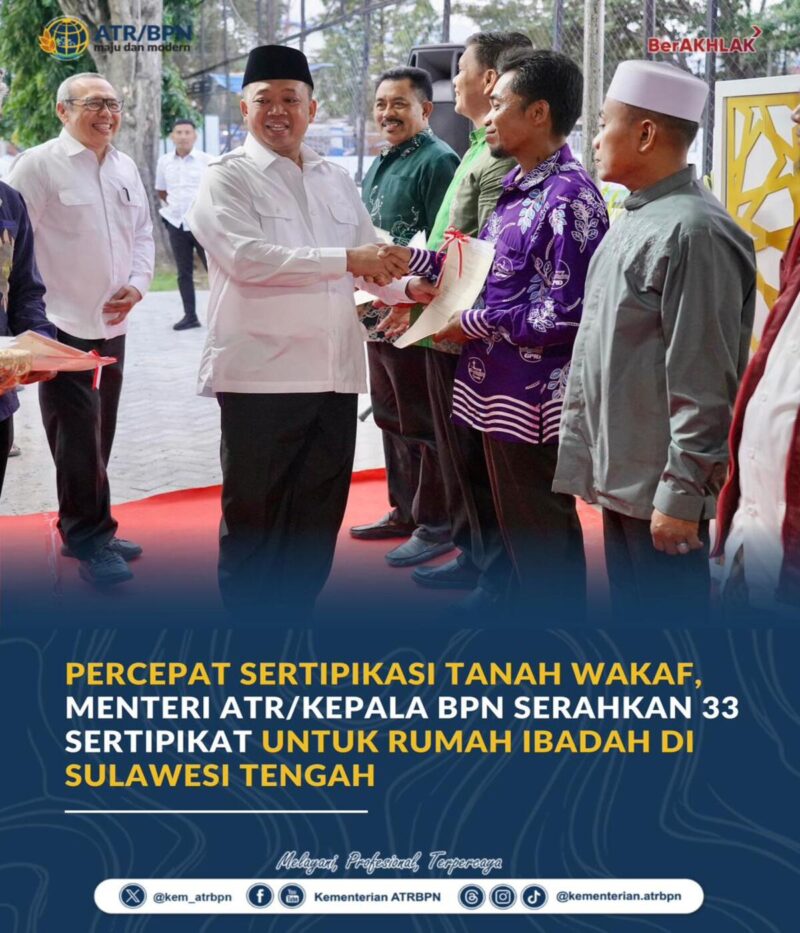 Percepat Sertipikasi Tanah Wakaf, Menteri ATR/Kepala BPN Serahkan 33 Sertipikat untuk Rumah Ibadah di Sulawesi Tengah
