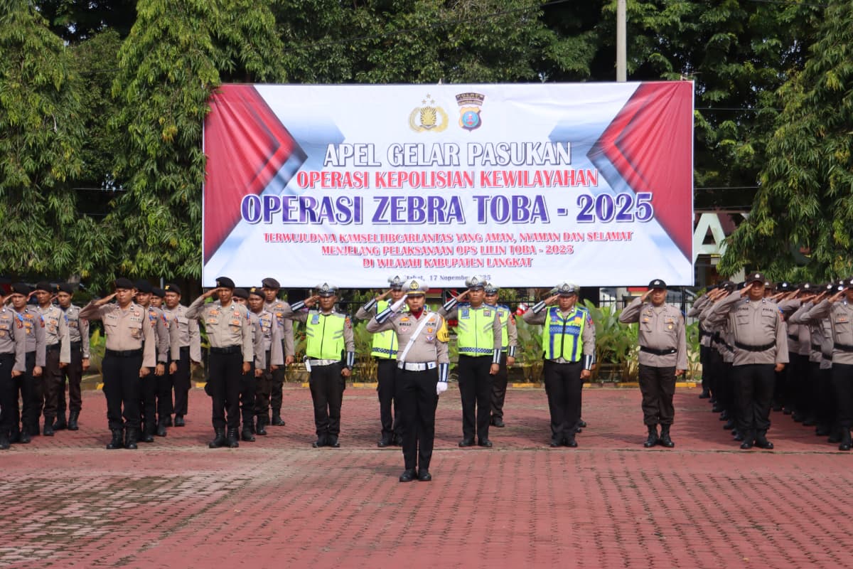 ANTARANEWS86.com_, LANGKAT, Kepolisian Resor (Polres) Langkat melaksanakan Apel Gelar Pasukan Operasi Kepolisian Kewilayahan “Zebra Toba-2025” pada Senin, 17 November 2025, di Lapangan Apel Polres Langkat. Operasi ini akan berlangsung selama 14 hari, mulai dari 17 hingga 30 November 2025, dengan fokus pada upaya meningkatkan keselamatan, ketertiban, dan kelancaran lalu lintas (Kamseltibcarlantas) menjelang Operasi Lilin 2025.