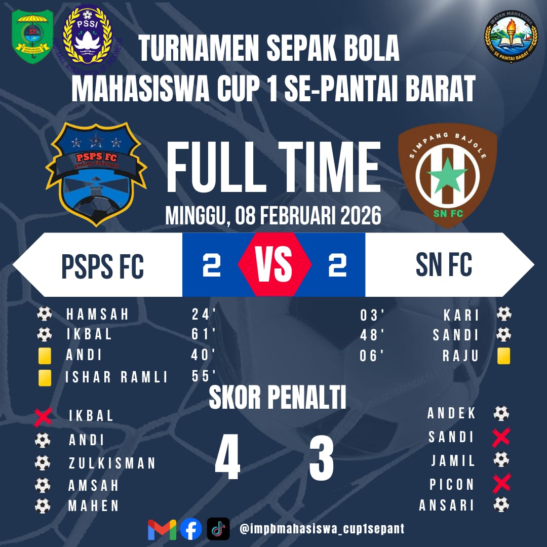 Duel sengit yang digelar penuh semangat sportivitas itu berakhir imbang 2–2 di waktu normal, sebelum PSPS FC memastikan kemenangan lewat drama adu penalti dengan skor 4–3.