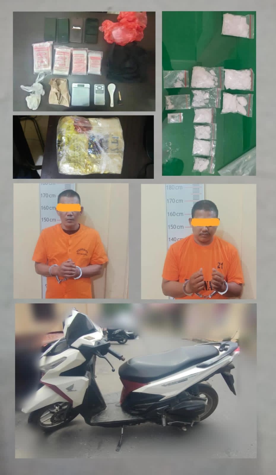 Sewaktu diamankan dan dilakukan penggeledahan badan / pakaian serta tempat sekitar ditemukan dari tersangka barang-barang berupa : 11 lembar plastik klip bening ukuran kecil yang di dalamnya berisi butiran kristal bening diduga narkotika jenis sabu, 2 (Dua) timbangan elektrik, 1 (Satu) sendok keramik., h. 1 (Satu) kertas warna coklat., dan 1 (Satu) bungkusan plastik Refined Chinese Tea JTY berisi kristal putih diduga narkotika jenis sabu, berat keseluruhan Barang Bukti Sabu 1.495,4 (Seribu empat ratus sembilan puluh lima koma empat) Gram.