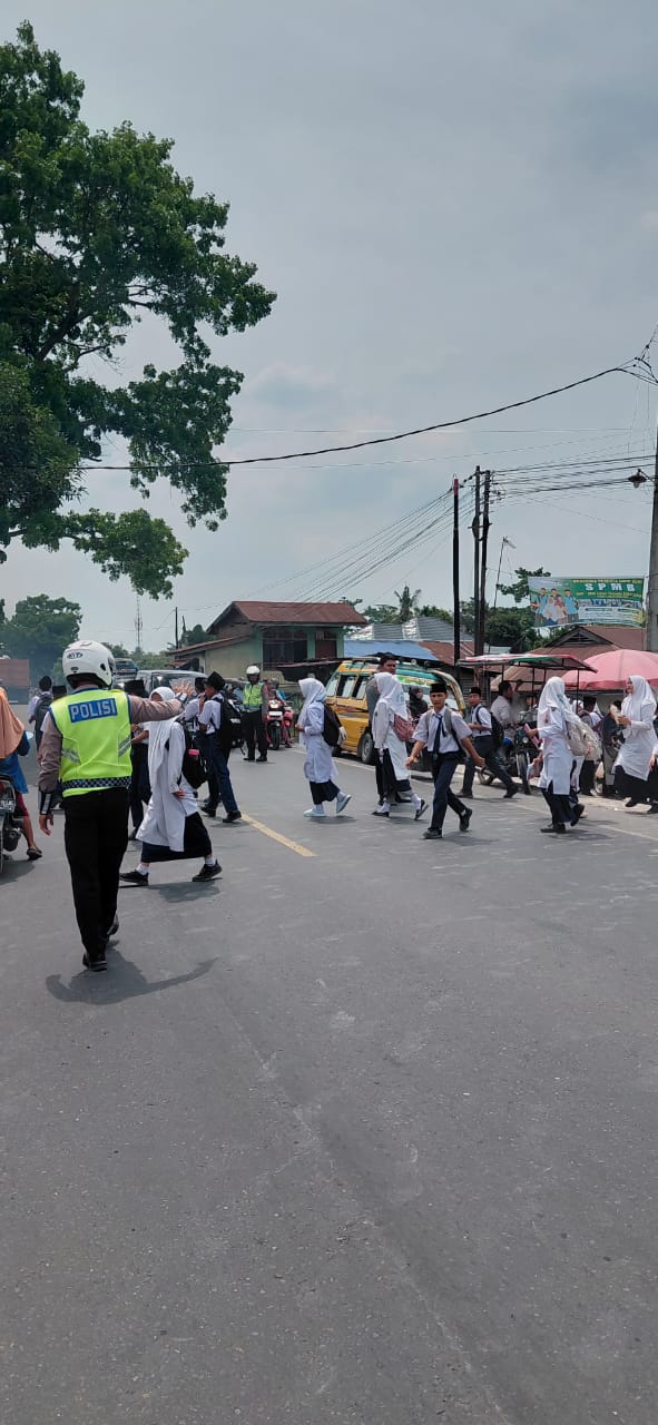 Personel Sat Lantas tampak aktif mengurai arus kendaraan sekaligus membantu para pelajar dan masyarakat menyeberang jalan dengan aman.