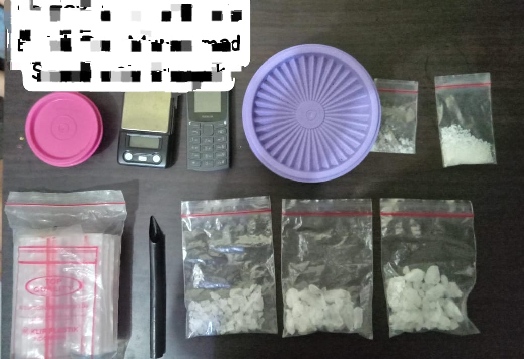 “Dari tangan Pelaku, petugas menyita Barang Bukti 5 paket sabu dengan total berat 61,69 gram, 1 (satu) buah alat penghisap sabu / bong,