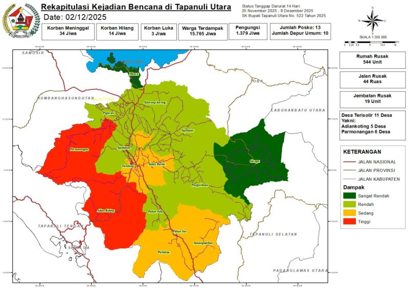 ANTARANEWS86.com_, TAPUT, Penanganan bencana di Kabupaten Tapanuli Utara terus dikebut setelah banjir bandang dan longsor melanda sejumlah kecamatan sejak 25 November 2025. Berdasarkan data terbaru yang dirilis Pemerintah Kabupaten Tapanuli Utara pada Selasa, 2 Desember 2025 pukul 19.00 WIB, tercatat sebanyak 15.765 warga terdampak. Bencana ini mengakibatkan 34 warga meninggal dunia (22 warga Tapanuli Utara dan 14 warga dari luar Taput), 14 orang masih hilang, serta 3 warga mengalami luka-luka. Di samping itu, kerusakan infrastruktur cukup masif, meliputi 544 unit rumah rusak, 19 jembatan putus, serta 44 ruas jalan yang tertutup material longsor maupun terputus akibat banjir.