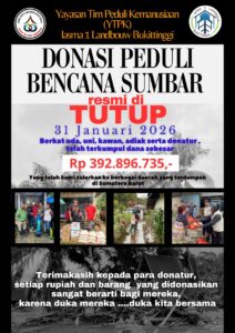 Penggalangan donasi sudah ditutup oleh Yayasan Tim Peduli Kemanusiaan (YTPK) IASMA 1 Bukittinggi sejak tanggal 31 Januari 2026. Donasi yang berasal dari alumni dan non alumni telah berhasil mengumpulkan dana hampir 500 juta belum termasuk barang telah disalurkan ke berbagai lokasi bencana di Sumatera Barat.